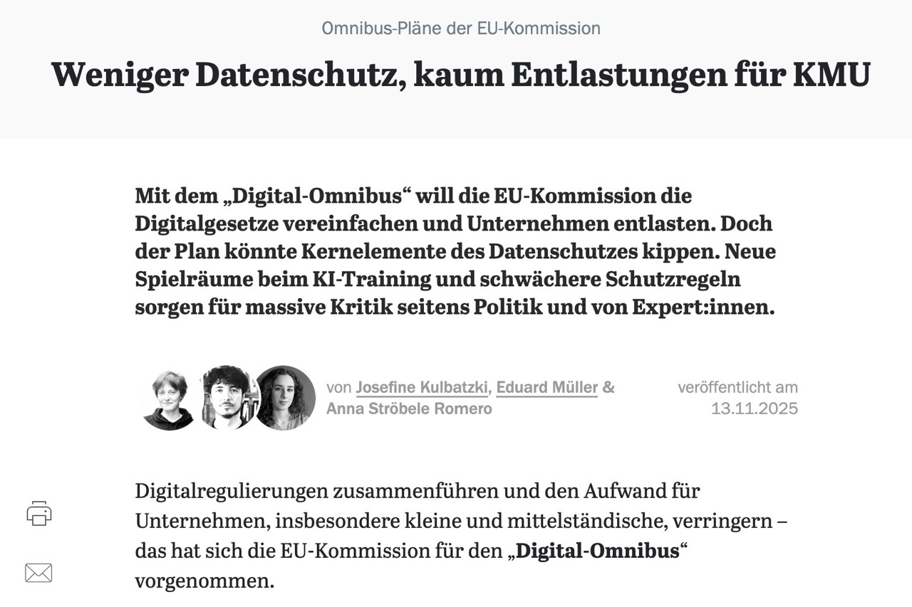 Im Tagesspiegel Background haben Josefine Kulbatzki, Eduard Müller und Anna Ströbele Romero die geleakten Omnibus-Pläne der Kommission kritisch beleuchtet. Im Artikel Omnibus Pläne der EU Kommission – Weniger Datenschutz, kaum Entlastungen für KMU (Paywall) kommen u.a. Max Schrems (noyb), Kilian Vieth-Ditlmann (Algorithmwatch), Itxaso Domínguez (European Digital Rights – Edri), Alexandra Geese (Grüne, Mitglied des Europäischen Parlaments), Dieter Kugelmann (LfDI Rheinland-Pfalz und Paulina Jo Pesch (FAU) zu Wort.